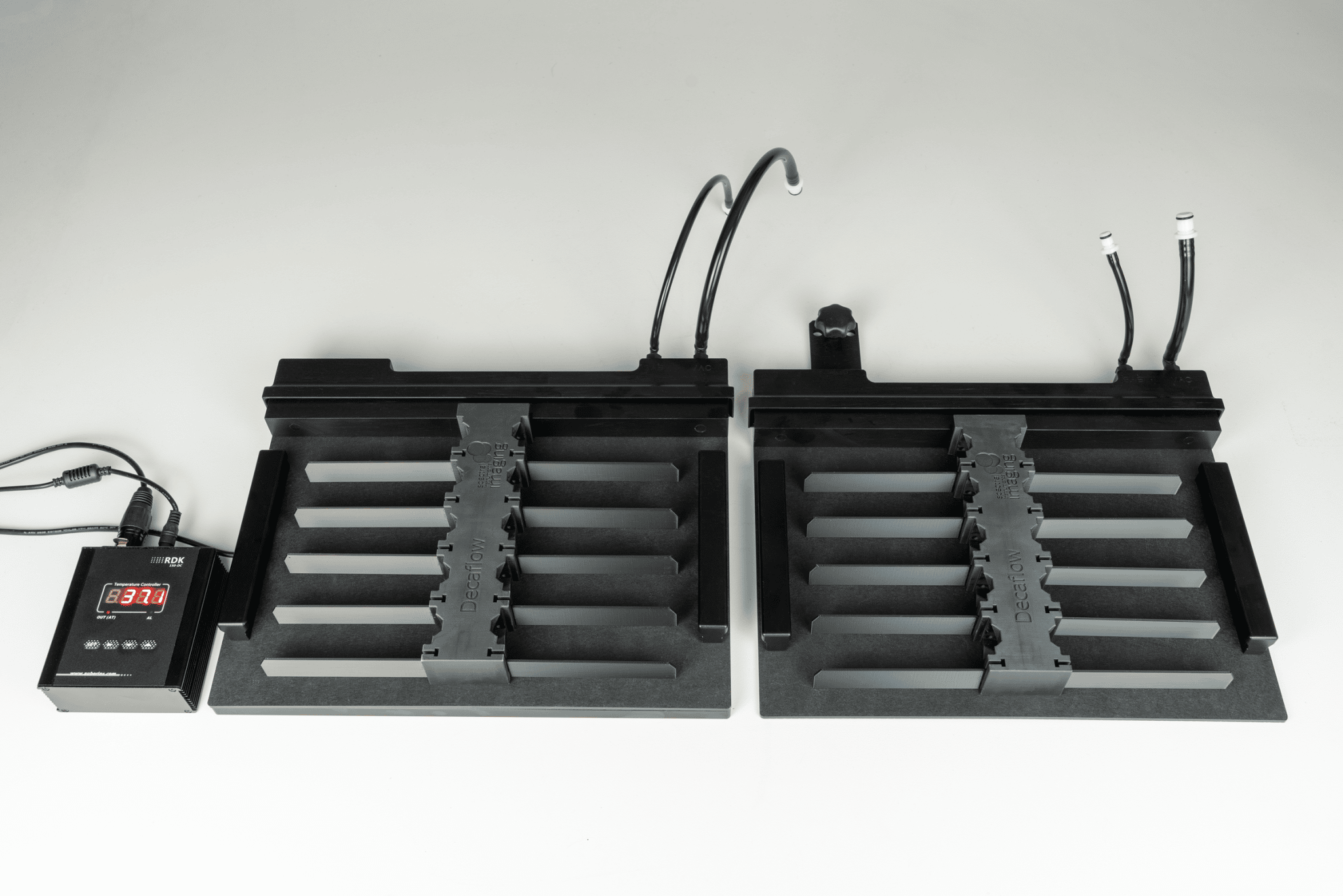 DecaFlow Animal Management System for Lago and Lago X allows for increased efficiency and accurate animal positioning. Easily stage 10 mice on the heated benchtop tray while the second tray is being imaged. Quickly swap trays for non-stop imaging!