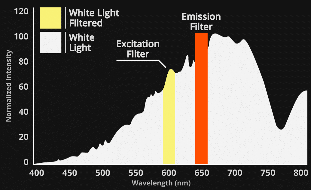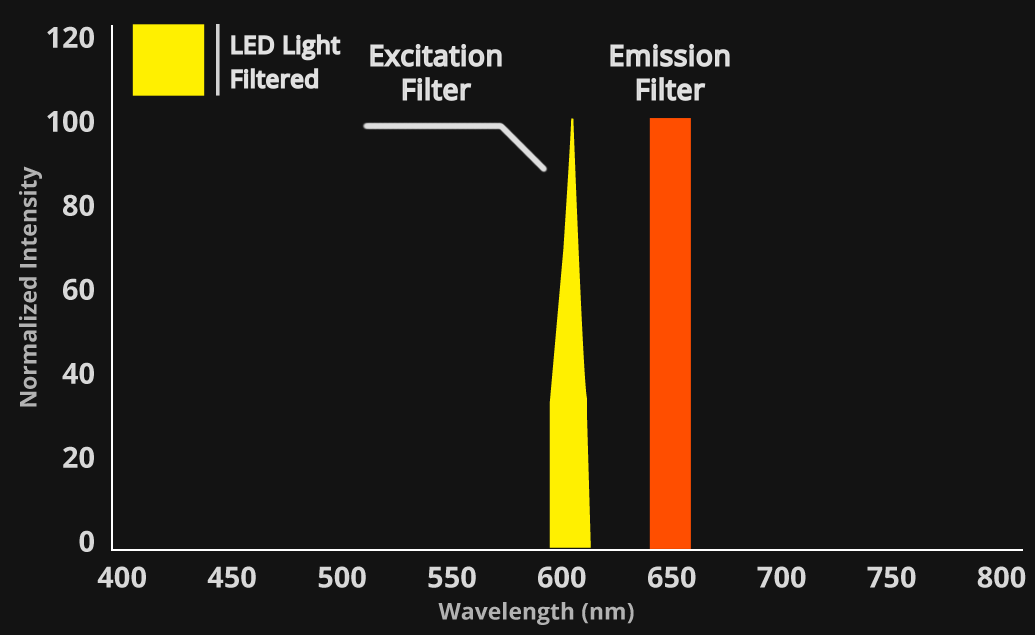 LED spectrums are inherently narrow and specific – falling within the 20 nm filter bandwidth