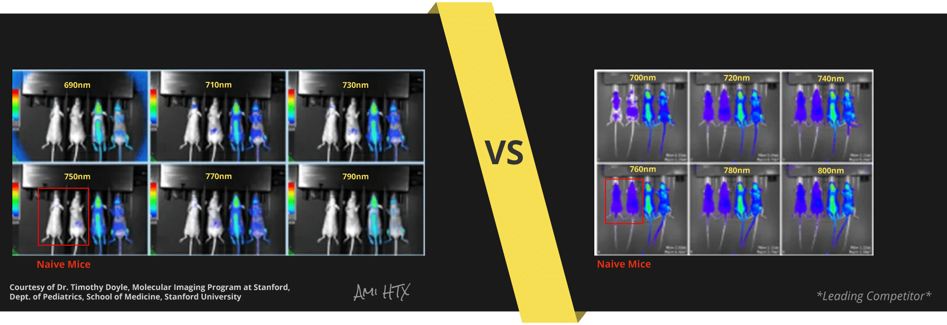 Out-of-band, excitation-based light is detected across a range of Em filters in white light based competitors. This non-specific, out-of-band light, reflects off mice, reducing Signal/Noise ratio.
